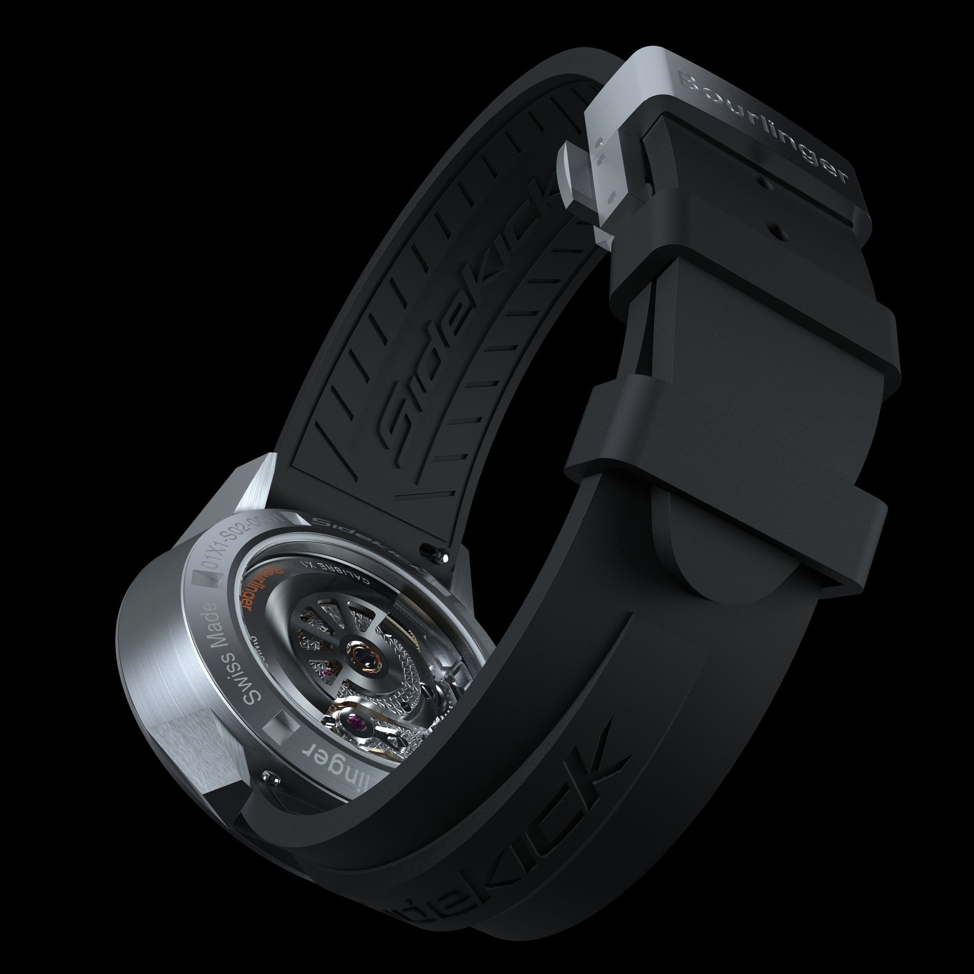 The FKM rubber strap offers a sporty yet sophisticated look, enhancing the Sidekick’s modern, seamless design. It complements the shape and angles of the lugs while providing superior comfort and durability. The strap features quick-release pins and a butterfly clasp, available in solid stainless steel or DLC-coated steel.